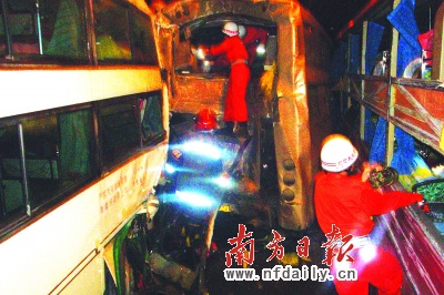 昨日傍晚,记者接到报料后采访了事故现场的乘客。从湖南乘车前往东莞务工的黄女士当时正在其中一辆大客车上。她告诉记者,当她昏昏欲睡的时候,突然被一阵刺耳的刹车声惊醒,躺在卧铺下辅的她竟飞身撞到了车顶。