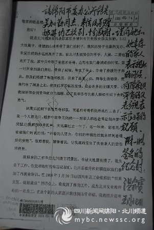 地震后就剩下爸爸哥哥和我,爸爸和哥哥都到外地打工去了,我一个人在北川。睡梦中常梦见妈妈……对亲人的思念让我在梦中哭醒,让我感到非常孤单。大地震过去一年了,这一年来,您在北川看望我们时说的话:“活着的人努力,你们的幸福生活就是对死者最好的安慰”,激励着我,鞭策着我,让我逐渐走出了失去亲人的悲伤和痛楚。