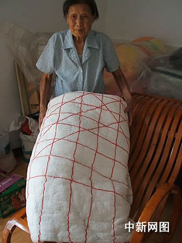 昨天上午,记者在镇江市区会棉街五十三号民宅,见到了住在这里的刘伏氏老太。刚刚过了九十大寿的刘老太精神矍铄,径直带记者爬上她家里的小阁楼,笑笑地指着一条与棉花被絮相似的海绵被絮说,这是她用自己近四十年吸烟积累下的过滤嘴海绵,花八元钱请人弹的。说完,老太还从口袋里掏出一包“大前门”香烟,抽出一支剥开过滤嘴包装纸,指着里面的海绵说:“这条被絮我就是用这些海绵弹成的……”记者看到,这条“香烟被絮”,其颜色洁白光亮,里面的丝绒十分柔软,且富有弹性,与普通棉花被絮显然不同。