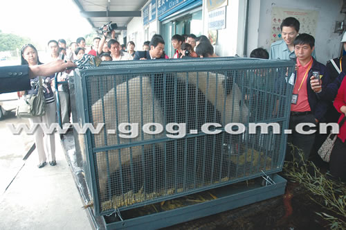 上午9点30分,迎接乐水和珠珠的车队终于得以离开机场,经过市区巡游后于11点40分来到贵阳扎佐森林野生动物园。此时,动物园门前的广场上已聚集了四五百人。