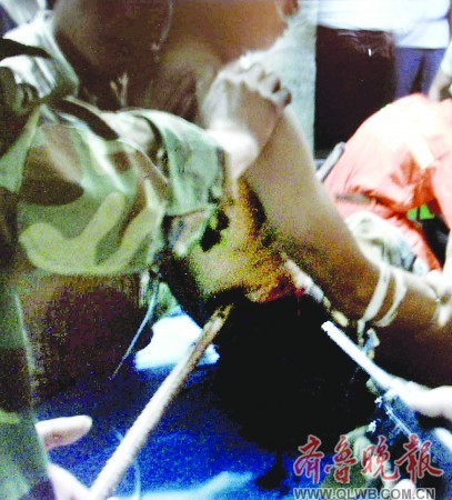 26日上午10时许,一辆救护车载着一位身受重伤的民工呼啸着驶入省立医院。车上这位名叫吴天洪的民工,一直在济南西部的京沪高铁工地打工,当天上午他在工地上一个深坑边干活时,脚下一滑,不慎面朝下掉进了两三米深的坑里。