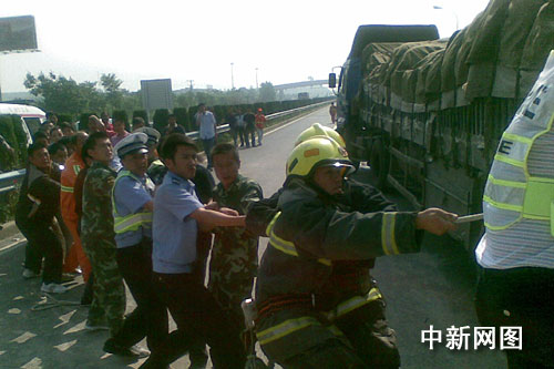 针对较为复杂的安徽牌照挂货车,由于车头紧贴前面车上所装的水泥,消防队员与现场群众先将水泥卸到路面上,腾出救援空间。随后利用无齿锯、液压剪等工具进行破拆。40多分钟后,两名被困人员被救出。