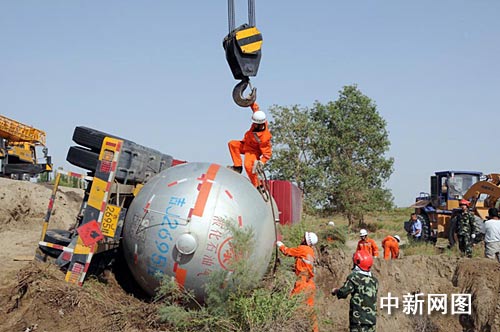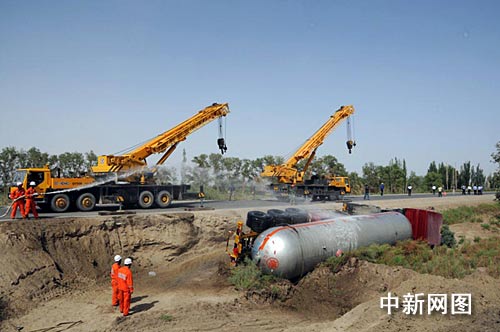 在救援车辆抵达现场后,由于事故车体长达17米、整车重为51吨、在路面4米之外,现场一时无法起吊。经研究决定,先将事故槽车与公路之间的路基由铲车开辟成临时停放事故车辆的平台,然后由两辆吊车协作将侧翻的液化车扶正;接着进行车头与罐体之间的分离,减轻起吊的重量和车头对吊装的影响;19时47分,两辆吊车协同作战将罐体一次成功吊起。