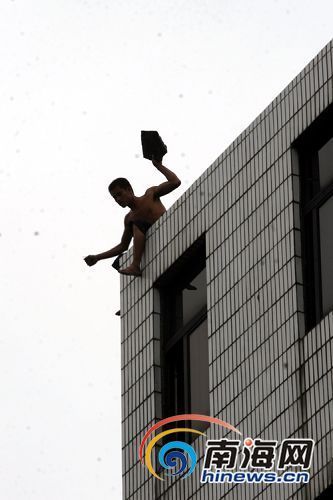 5月30日下午1时40分左右,一名男子跑到海口市琼山区府城中山路琼台师范对面一幢6层楼顶上欲跳楼。海口市公安局云露派出所、琼山消防中队的民警赶到现场进行营救,没想到男子坐在楼顶边缘处拿石头往楼下扔,向民警发起“挑战”。经过半个小时的营救,男子被安全救下楼,疑似精神病患者。