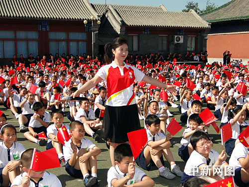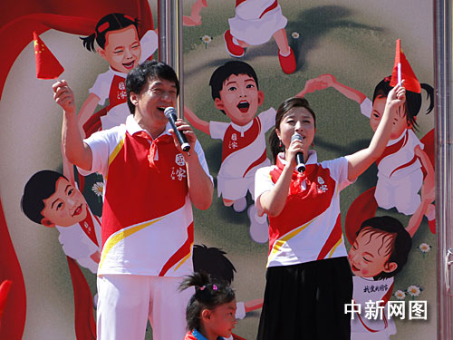 中新网5月31日电 5月31日,国庆献礼歌曲《国家》的主唱成龙、刘媛媛分别来到北京市七一小学、府学小学及中国儿童中心,与孩子们共同参加了形式各异,精彩纷呈的庆六一活动。