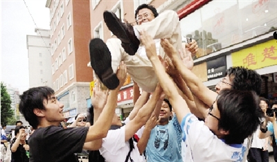 高考最后一门英语结束了,对紧绷的高三学生来说,这是一个欢乐的时刻,轻松的时刻。周南中学十几名高三学生,刚走出长沙一中考点,便将班主任吴老师举起抛向了空中。