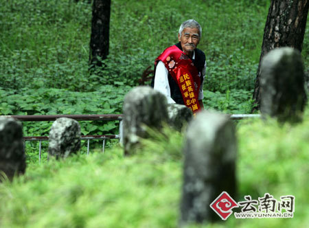 松柏、翠竹掩映下的国殇墓园,环境清幽肃穆,老兵们踏着青石板铺成的长甬道,平静地走向墓园深处。随行的人们默默跟随其后。在忠烈祠下,腾冲县里举行了简短而热烈的欢迎式。88岁的刘召回老人代表老兵们对一路来各方面的照顾表示感谢,随即老人就用四川话讲述起了那段鲜为人知的历史。
