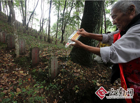 墓地一角,有十多位老人看着刘召回出神,当他们知道这老人是中国远征军老兵后,都围了上来。“我们是昆明来的离休干部,最大的88岁了,没想到在墓园里还能遇到活着的老兵!”一位老先生激动地说。众人搀扶着刘召回远去,一位老妈妈用纸擦拭从布满皱纹的脸颊上流下的泪水,默默目送这些老兵们。