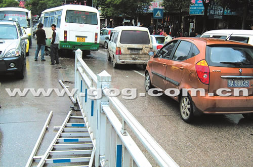 在斑马线上的行人 被撞飞的隔离栏砸伤
