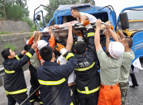第二名被困人员钟国恩的额头、胳膊满是鲜血,左腿被死死卡在驾驶室前台之间,丝毫无法动弹。液压破拆器材、机动链锯收效甚微。随后,消防指挥员调来救援拖车,用车辆牵引的办法来营救被困人员,经过约一个小时多次牵引,终于牵开了缝隙,伤者被抬出驾驶室,送往医院接受治疗。