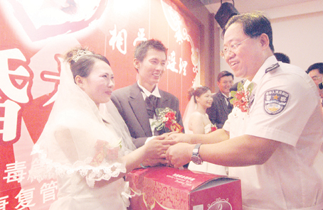 在鞭炮声中,新郎们把身着婚纱的新娘接回康复所为他们免费提供的新房。之后,随着婚礼进行曲响起,3对新人相挽着步入康复所内布置的婚礼仪式现场。广东电视台主持人侯玉婷为他们主持了婚礼仪式,广东省戒毒管理局局长施红辉为3对新人证婚。施红辉说:“这是全国戒毒康复场所的首次集体婚礼。”