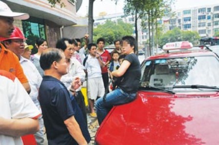 昨日上午11时许,在象山北路与阳明路交叉口附近,一名身穿深色上衣的女子坐在一辆红色出租车车顶,不停地指责站在一旁的出租车司机。没过多久,该出租车附近便围满了市民。