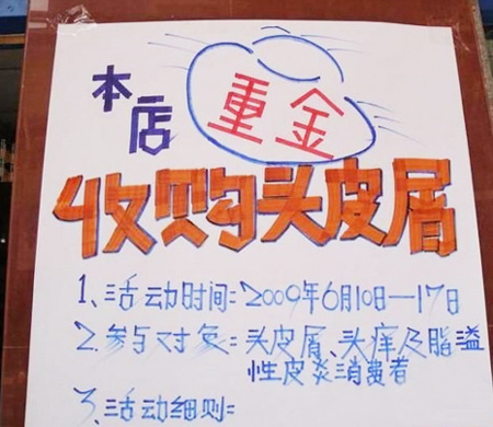 在朝闻网、搜狐社区、新浪论坛上,一篇名为《暴强!药店竟然收购头皮屑》的帖子,引发网友热议。帖中说,自己在经过住地附近的一家药店时看到,店门口竟贴出一张海报要收购头屑!这可怎么算,按斤称?论两算?不是,是以片儿算,店方开出了每片头屑100元的天价。楼主惊叹,见过收废品收古董啥的,“这回我真是被雷着了!我看这药店老板肯定是个脑残,还不如直接送钱好了……”