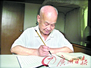“登山抄书饭两碗,一梦甜甜天已明。”这是张荣标老人的写诗自描。85岁的张伯,老家梅县,如今一个人住在广州海印桥北的海印花园。张伯在广州的工商银行工作了40年,做了一辈子出纳员,退休后又返聘了十三载,到2001年才彻底离岗。老人家耳聪目明,每顿两碗饭。退休后这8年来,老人家几乎每天都做两件事:一件是早饭前去爬白云山,在山腰锻炼腰腿;另一件事是每天在屋中写字半日,两个习惯风雨不改。(记者石善伟摄影报道)