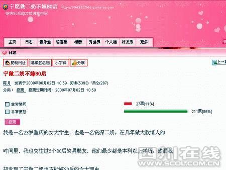 该QQ空间名为“宁愿做二奶不嫁80后”,一共只有两篇日志:《本人真实个人资料》和《宁做二奶不嫁80后》,先后发表于6月2日10:55和10:59,前后相差4分钟。相册里仅有一张照片,即网帖里公布的那一张“本人真实照片”。