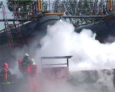 据了解,该罐区共有3个大罐和1个小罐,液化气储量达百余吨。10分钟后,消防员终于发现,是位于罐体底部的管道连接管发生了断裂导致泄漏,此时已经有近10吨的液化气泄漏。他们立即采取措施,找到泄漏管道总阀门并关闭。随后,消防员动用6支水枪对液化气罐体及其周围喷水稀释,以降低浓度。