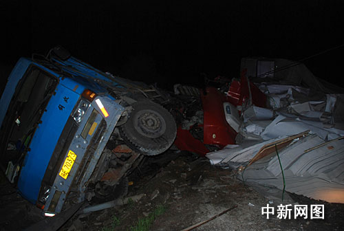 2时10分,消防救援队赶到现场,现场可以看出,两辆大货车是由西往东方向追尾的。前面的那大型货车已经被撞的侧翻出了护栏外,车边路面上散满玻璃碎片和车上的货物,事故现场一片狼籍。追尾货车的车头与车厢已经分离,车头与侧翻货车的地盘紧密粘合在一起,由于冲撞过于猛烈,该车的驾驶室已不复存在。副驾驶室的一名男子被变形车头夹扁,已经死亡。