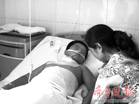 7月9日上午,记者赶到济南市第四人民医院住院部耳鼻喉科病房。小凯躺在病床上,偶尔跟妈妈说说话。他的脖子上缠着厚厚的纱布,下巴处还残留着凝固的血渍。由于伤及颈部食道及气管,小凯不能开口进食,只能通过胃管导引流食。