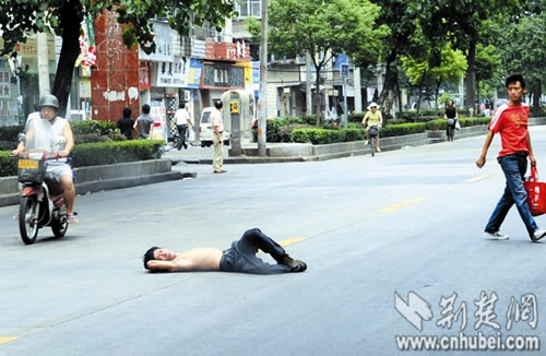 事发昨日正午,记者在汉阳郭茨口看到,一名男子上身裸露,手提一袋医院的病历资料,情绪激动地躺在马路中央,脊背被路面烫得通红。此时路面车流不息,该男子处境十分危险。“快把他拉回来!”几名路人见状后,靠近该男子,欲将其拉到路边,但该男子并不领情,坚决不起身。几分钟后,二桥派出所的民警赶来,要求该男子去派出所再说,该男子置之不理。民警表示,早8时许和10时许,该男子曾在附近路面躺过两次,都被他们带回了派出所,他们这已是第三次为该男子出警。“有什么委屈就说出来,那样心里痛快点。”见民警束手无策,热心路人们开始轮番上前劝解。众路人汗流浃背,顶着烈日站在马路中央,对该男子动之以情、晓之以理。半小时后,该男子陆续说出了心中的不快。又经劝解,该男子终于答应跟民警回派出所,将事情说清楚。