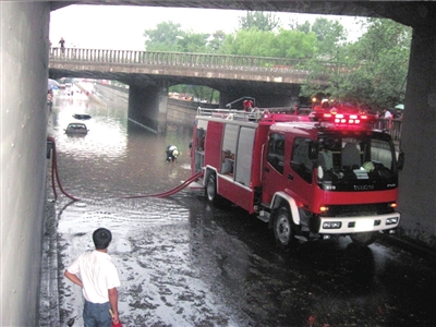 由于路面上的污水井处水位很深,并被泥沙封盖一时难以找到,消防员只好利用水带,将抽出的积水排到两侧人行通道上的污水井中。经过消防员一个半小时的努力,积水被完全排除,紧接着,两辆小轿车被到场的拖车拖离现场,交通随即恢复正常。
