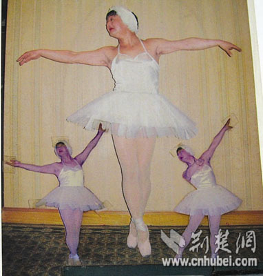 涂飞家住武昌民主路社区,他家桌子上、电视机顶上摆满了他表演的剧照。有《回娘家》里的大姑娘扮相,有模仿卓别林的扮相,有蒙古舞的扮相。当然,在众多剧照中,尺寸最大的还是身穿芭蕾裙的“小天鹅”扮相。“用面具挡住我的脸,很多人还都以为我是个大姑娘呢。”涂飞笑着说。