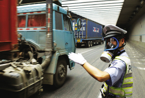 图为昨天中午,宝山交警支队民警何海清在外环隧道内头戴防毒面具值勤,外环隧道内的汽车尾气加上高温天的热度,能让人窒息