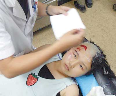 中午11时,在市儿童医院的脑外科住院部,记者见到了受伤女孩及其家属。小女孩头缠纱布,右脸颧骨红肿,满是血污。父亲刘兴兵和妻子一脸焦虑,正用湿巾帮助女儿清洗脚上的血迹。