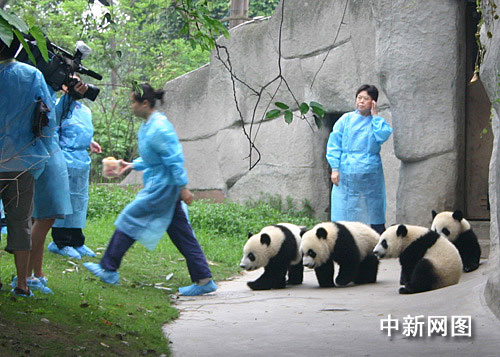 中新网成都7月22日电 (霍潺) 七月二十二日早上约八点半,成都大熊猫基地九个月大的大熊猫贝贝和同伴迎迎、大毛总共六只大熊猫在饲养员的陪同下欢快地跑出兽社,来到“幼稚园”玩耍。