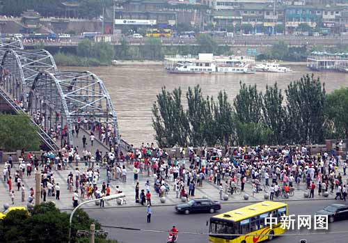 中新网兰州7月22日电 (记者 刘薛梅) 为观看500年一遇的罕见天象日全食,7月22日一大早,甘肃兰州百年铁桥中山桥广场陆续聚集了近千人,借助西北师大天文台提供的专业观测设备,欣赏兰州上空出现的日偏食。