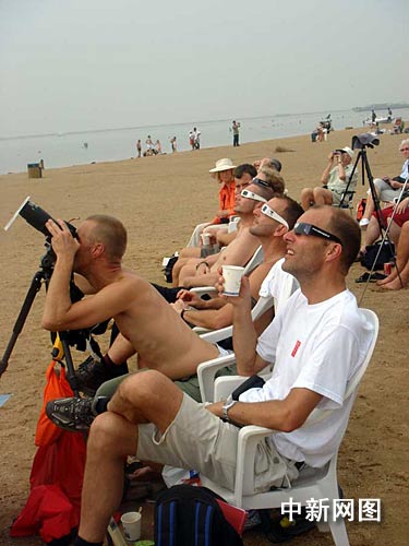 当天早晨七点左右,记者来自上海市郊的金山城市沙滩。在这一被称为本次日全食中国最佳观测点之一的沙滩上已经聚集了一千多名境外天文爱好者。据悉,此次“跨国追日”活动是由上海、江苏、云南三地的八家旅行社策划组织的,成员分别来自美国、加拿大、意大利、西班牙、荷兰、瑞典、丹麦、日本、泰国等国家。