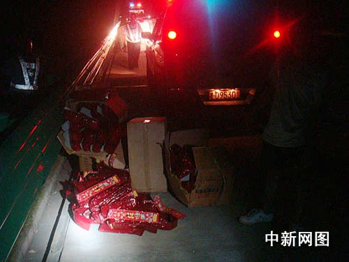 中新网长沙7月23日电 (雷坤平 肖前辉) 23日凌晨,湖南邵怀高速交警大队邵阳南中队在处理一起侧翻事故时,从事故地点附近的护坡下发现被遗弃的4箱鞭炮和1箱烟花。经查证,这些烟花鞭炮均为侧翻事故车主所丢弃,事故原因还在进一步调查当中。