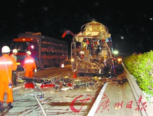 记者现场看到,一辆从南宁开往中山的大巴追尾撞上一辆装载重油的运油车,大巴车头被撞瘪,凹入车体约1米,地上布满乘客行李、玻璃片、汽车零件等,在路边紧急停车带停着一辆怀疑被追尾的槽罐车。大巴司机已当场死亡,车上21人受伤。目前,事故原因和善后等工作仍在调查和处理中。(记者关家玉 通讯员黄楚凡、梁华超、周翔 摄影报道)