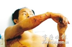 昨日,记者在市急救中心见到周先生。经医生检查,周双手皮肤多处撕裂,双上肢、腋窝、胸部有十几处咬伤,深至骨头。