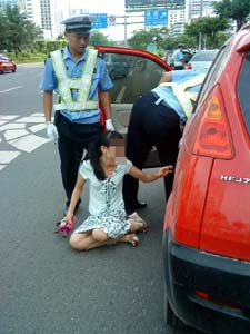 记者在现场看到,女司机被拦下后,交出了驾驶证,但是,当她看到交警准备开处罚单时,立即下车,试图抢夺驾驶证。“你怎么知道我没系安全带,我系了。”该女子喊道。“你拐弯时看到我们交警检查后才匆匆忙忙系的安全带。你不用狡辩,请接受处理。”李警官说道。