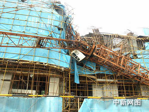 中新网郑州七月三十日电(记者 朱晓娟 通讯员李学锋)7月30日上午8时许,郑州市未来路上一建筑工地内正在使用的塔吊发生倒塌,巨大的钢结构塔吊基座和吊臂硬生生地砸在了正在施工的建筑物顶部,当场造成4名民工受伤被困。事故发生后,当地公安、消防、安监和医疗单位的救援人员迅速赶赴现场,迅速开展救人排险,成功化解了一场危机。
