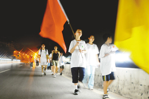 8月8日凌晨4点,白天喧嚣的洋人街一片静悄悄。数十名男女身穿统一的T恤,手拿矿泉水瓶,坚定地朝前走。头天深夜从大礼堂出发,沿两路口、长江大桥,到南滨路、弹子石洋人街,他们已走了一个通宵。