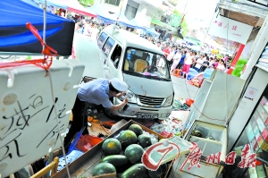 昨日下午1时30分,禅城平桂街的丽晶市场,一辆面包车发疯似的冲进一个水果店,将路过此处的邓松香老人撞飞几米外,制衣厂女工阿玲则被碾在车下,面包车撞翻水果店,顶翻三台冰柜,将老板娘胡金水从躺椅上撞下来。