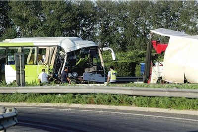 昨天下午5点左右,在京承高速黄港出口附近,一辆从怀柔驶来的916路公交车,与一辆运水货车追尾,事故造成公交车上20多人受伤。