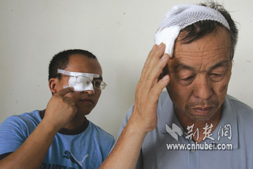 昨天上午10时许,记者在省人民医院见到陈先生时,他与老婆、丈人和侄子正穿梭于多个科室。四人身上都有多处棍伤,其中,陈先生老丈人头部被打破,陈先生一只眼晴被打伤以纱布包扎。