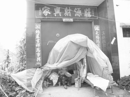 8月10日下午,记者在冯村乡前吴村祁恪兴家门口看到,他家大门紧闭着,门外放着两张木床,一横一竖,上面还搭着个塑料棚子,将大门挡得严严实实。80岁的祁王氏躺在横放着的床上,其女祁守荣在一旁看护她(如图)。