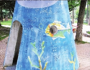昨日有市民投诉称,市青少年宫内—处“趣味天地”的儿童游乐场“城堡”,被—些入视为“爱情宣言”之处,刻写得面目全非。