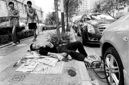 洪作刚说,他担心即使通过法律途径对方也不肯还钱。于是,8月13日下午,他买来一把U型大锁,白天就将车锁在下水道铁栅栏上,连着3天晚上,怕自己睡着、老板将车开走,他就将锁子的另一头锁在自己的脚踝上。晚上,他就睡在马路边的报纸上,路边蚊子多,他就在周围点上四盘蚊香。