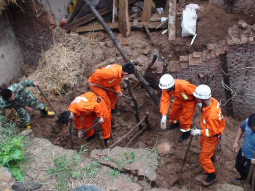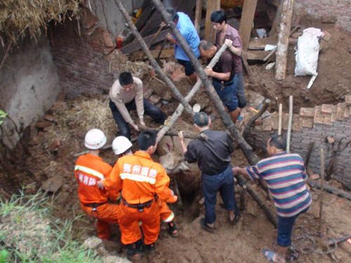 登封市公安消防大队介绍,昨日他们接到登封市公安局110指挥中心指令:登封市唐庄乡塔水磨陈庄村一村民家内两间相邻的民房坍塌,有位70多岁的老人和两头700多斤重的牛被活埋,请求救援。