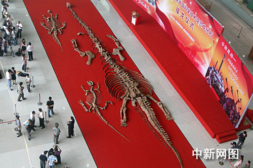 中新网北京8月18日电 (记者 孙自法)三具侏罗纪时期的恐龙化石,十八日下午在它们的“新家”——中国科学技术馆新馆揭开“红盖头”,正式由云南省楚雄彝族自治州“嫁”入北京落户中国科技馆新馆,并将于下月中旬新馆开放后进行永久性展出。