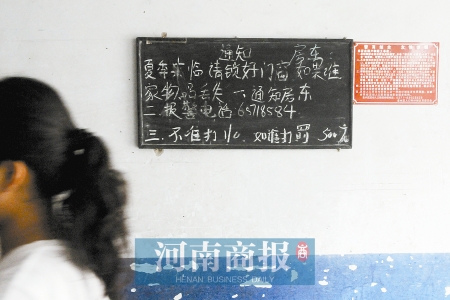 李先生是这栋楼的房东,身后墙壁挂的黑板上,写着一则通知:“夏季来临请锁好门窗,如果谁家物品丢失:一、通知房东;二、报警电话65718584;三、不准打110,如谁打罚500元。”