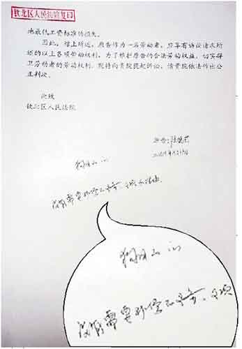 去年12月8日,李先生到法院查阅案件材料时,在一份起诉状的末页,看到有人在空白处写下了两行文字。上一行写着“狗日的”字样,下一行则写着“没有需要补偿的义务、事项和理由”字样(见左图)。夫妻俩认为,有人误导和左右了此次判案。