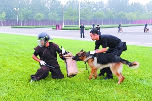 昨天,十余名首都机场分局驯犬员带领着6只德国牧羊犬在首都机场专机楼广场进行了集训。这6只警犬是今年6月,机场公安分局张志副局长带队三上沈阳到公安部沈阳警犬基地精心挑选的。入选条件非常严格,从警犬的神经类型敏感度到兴奋度,从犬只的听力到四肢的力量,都需要符合严格标准。(记者王蔷)