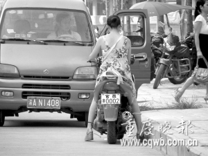 前日下午5时许,记者途经开县县城,偶然撞见一名身着黄色吊带裙、脚踩高跟松糕凉鞋、年纪30岁出头的时尚美女,蹬着一辆女式踏板摩托车,行驶在城区主干道上。令人惊奇的是,其白底黑字的车牌号竟为“官员 赛0002”(如图)!