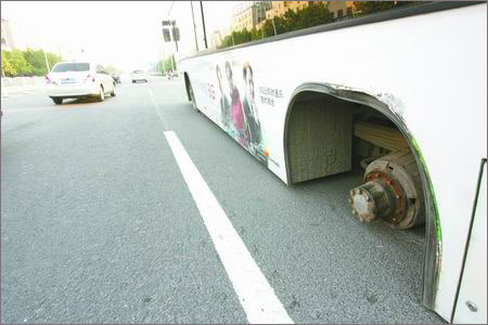 昨天下午,一辆53路空调公交车行驶时,左后侧两个车轮突然脱落,导致车身倾斜划伤路面约20米,所幸没有造成人员受伤。