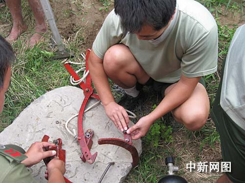 在现场笔者看到,消防官兵自制的救生工具很特殊,几块涂红的铁片用螺丝一拧紧,成了一个“剪刀状”和“圆形状”的救生工具。据发明人浚县消防大队代理排长韩全利介绍:该救生工具是综合近年来部队在处置深井救援事故中出现的救援难度大、危险程度高、耗时时间长等情况,结合被困者实际而量身打造的。该工具最大的好处在于,只要消防官兵将工具抛向井底,被困者就可将“剪刀状”和“圆形”的救生器材系在身上,消防官兵再利用三角架,直接可以迅速的将被困者从井底拉出地面。